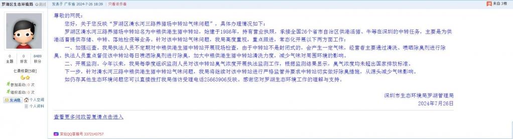 罗湖区清水河三路养猪场中转站名为中粮供港生猪中转站,始建于1986年,持有营业执照,承接全国26个省市自治区供港活猪、牛等在深圳的中转任务,主要是为供港活畜提供存储、中转、落地检疫等业务。针对该中转站气味问题,我局高度重视,重点跟进,常态化开展以下两方面工作:
