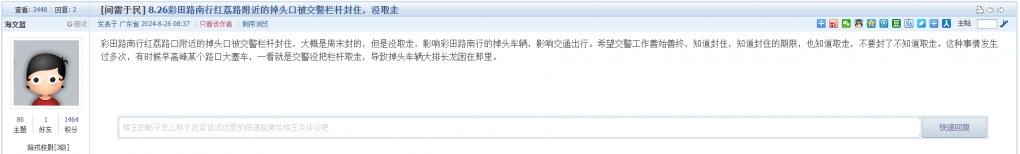 16. 帖文《8.26彩田路南行红荔路附近的掉头口被交警栏杆封住,没取走》