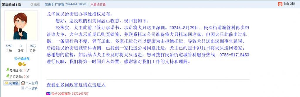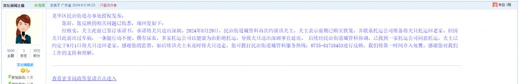 您好,您反映的相关问题已收悉,现回复如下:经核实,犬主此前已签订承诺书,承诺将犬只送出深圳。2024年8月29日,民治街道城管科再次约谈该犬主,犬主表示前期已购买铁笼,并联系托运公司准备将犬只托运回老家。但因犬只此前出过车祸,一条腿行动不便、偶有尿血,多家托运公司以健康为由拒绝托运,导致犬只送出深圳事宜延误。 后续经民治街道城管科协调,已找到一家托运公司同意托运,犬主已约定于9月1日将犬只送回老家。感谢您的监督,如后续该犬主未及时将犬只送走,您可拨打民治街道城管科服务热线:0755-81718453进行反映,我们将第一时间介入处置。感谢您对我们工作的支持和理解。