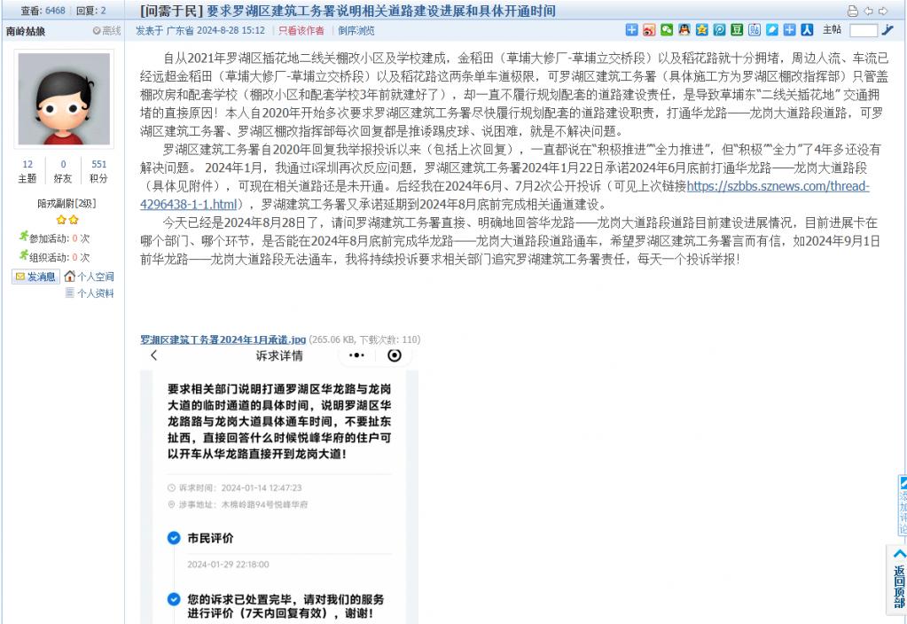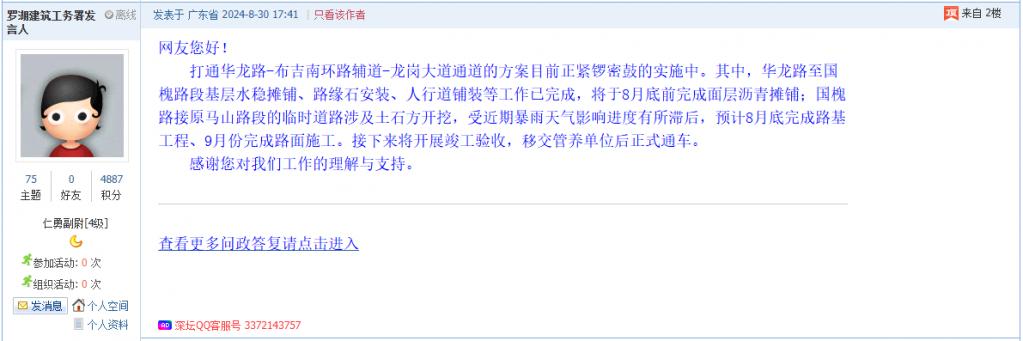5. 帖文《要求罗湖区建筑工务署说明相关道路建设进展和具体开通时间》