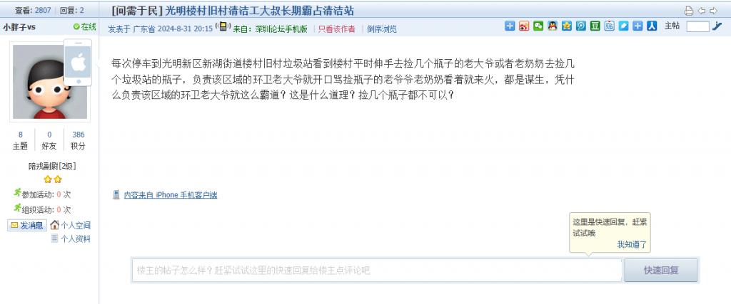 14. 帖文《光明楼村旧村清洁工大叔长期霸占清洁站》