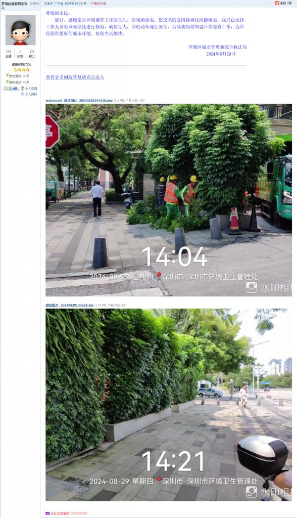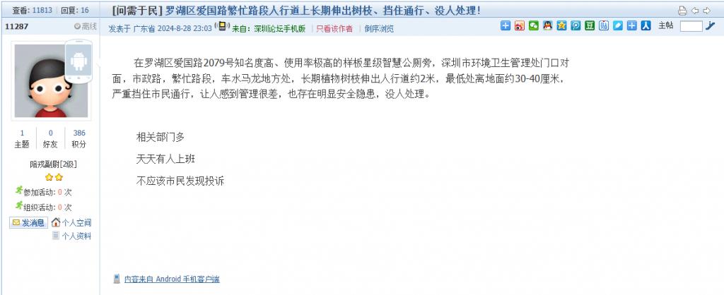 6. 帖文《罗湖区爱国路繁忙路段人行道上长期伸出树枝、挡住通行、没人处理!》