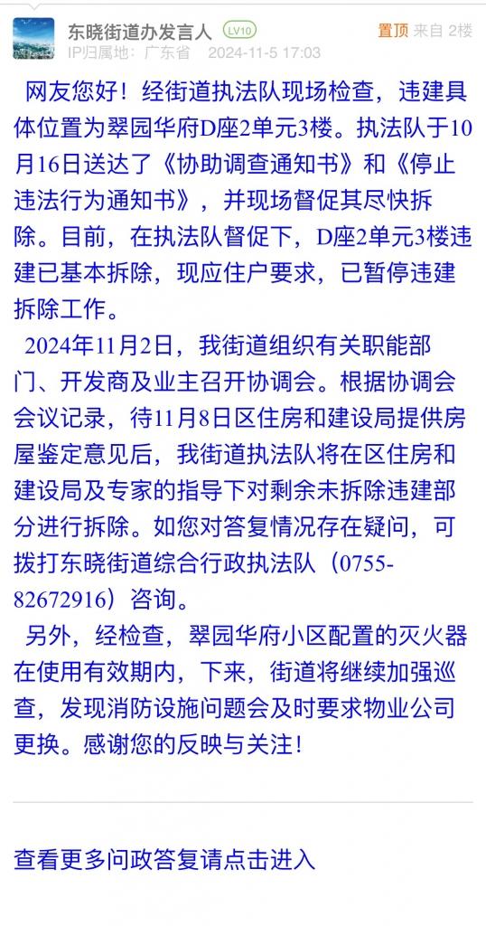 2024年11月2日,我街道组织有关职能部门、开发商及业主召开协调会。根据协调会会议记录,待11月8日区住房和建设局提供房屋鉴定意见后,我街道执法队将在区住房和建设局及专家的指导下对剩余未拆除违建部分进行拆除。如您对答复情况存在疑问,可拨打东晓街道综合行政执法队(0755-82672916)咨询。