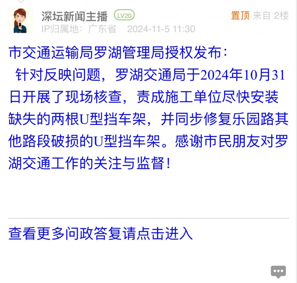 针对反映问题,罗湖交通局于2024年10月31日开展了现场核查,责成施工单位尽快安装缺失的两根U型挡车架,并同步修复乐园路其他路段破损的U型挡车架。感谢市民朋友对罗湖交通工作的关注与监督!