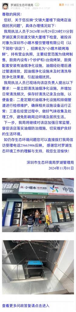 我局执法人员于2024年10月29日20时35分到罗湖区黄贝街道文锦大厦楼下检查,被投诉对象为深圳市小嘿木餐饮管理有限公司(以下简称“该店”),招牌名为“小嘿木碳烤海鲜”,持有营业执照,主要经营范围为烧烤制售,厨房内设有1个炒炉和1台烧烤架,厨房配套安装有油烟净化设施,油烟经处理后通过管道排放,因油烟净化设施未及时清洗导致净化效果差,引起油烟扰民。