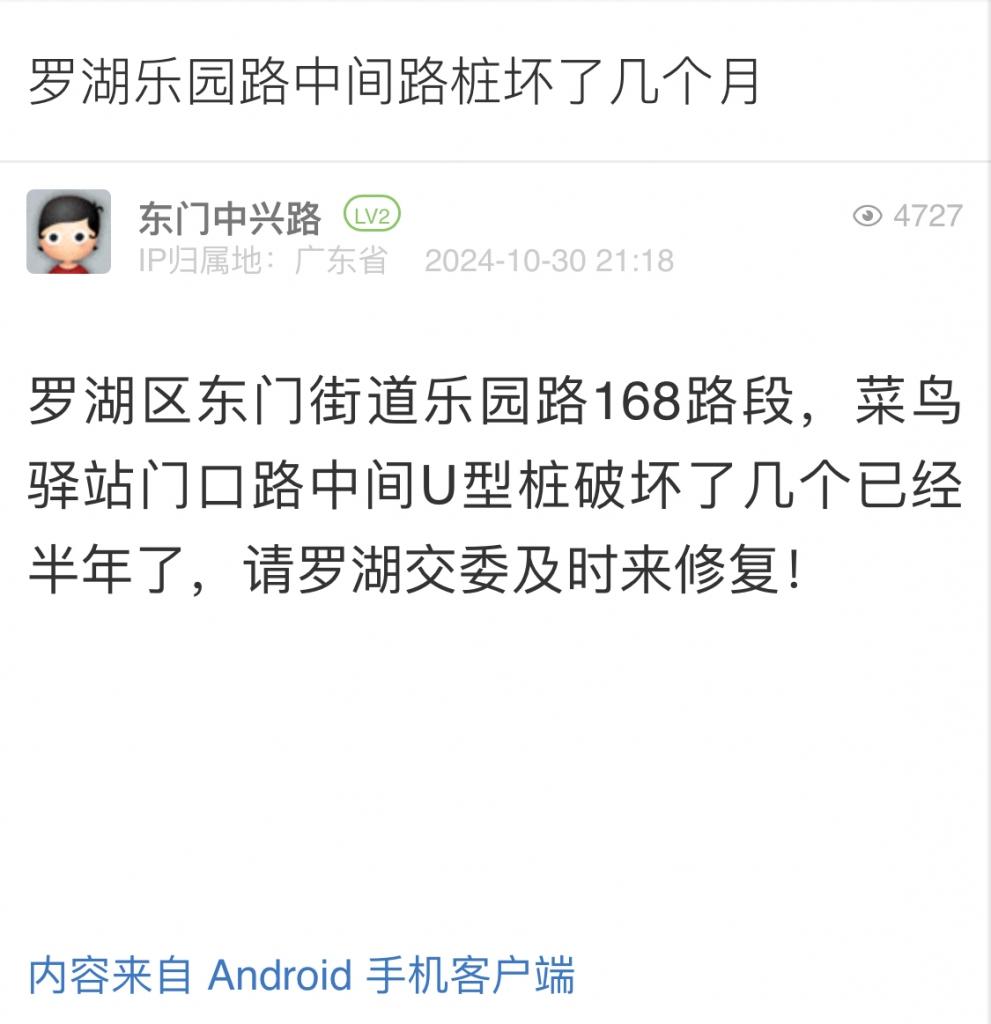 11. 帖文《罗湖乐园路中间路桩坏了几个月》