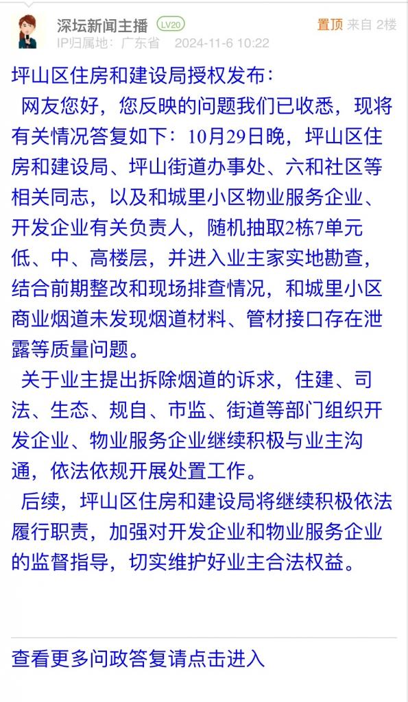 网友您好,您反映的问题我们已收悉,现将有关情况答复如下:10月29日晚,坪山区住房和建设局、坪山街道办事处、六和社区等相关同志,以及和城里小区物业服务企业、开发企业有关负责人,随机抽取2栋7单元低、中、高楼层,并进入业主家实地勘查,结合前期整改和现场排查情况,和城里小区商业烟道未发现烟道材料、管材接口存在泄露等质量问题。