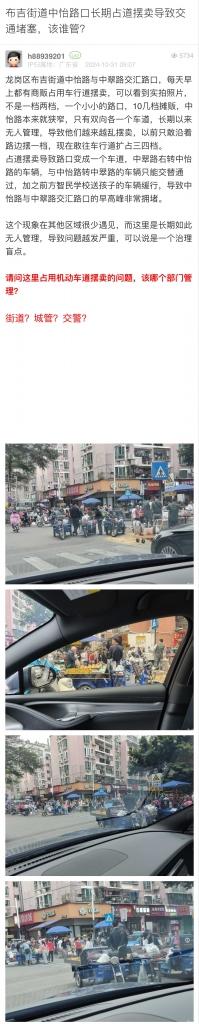 13. 帖文《布吉街道中怡路口长期占道摆卖导致交通堵塞,该谁管?》