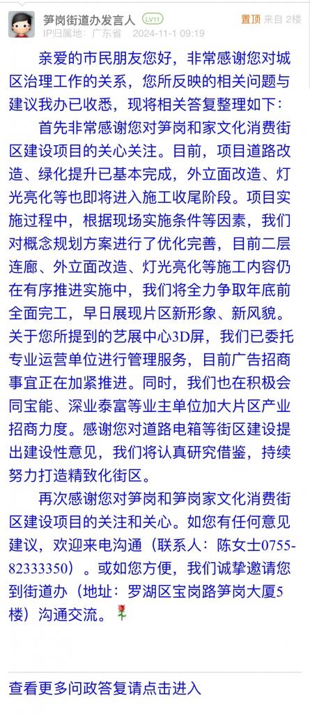 再次感谢您对笋岗和笋岗家文化消费街区建设项目的关注和关心。如您有任何意见建议,欢迎来电沟通(联系人:陈女士0755-82333350)。或如您方便,我们诚挚邀请您到街道办(地址:罗湖区宝岗路笋岗大厦5楼)沟通交流。