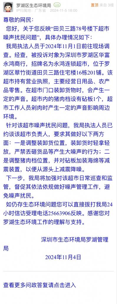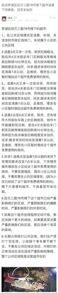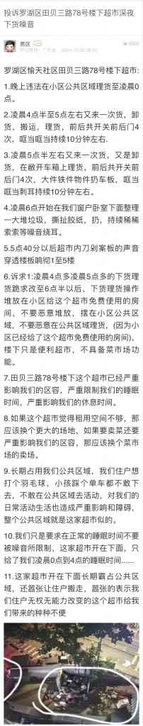 14. 帖文《投诉罗湖区田贝三路78号楼下超市凌晨下货噪音,且变本加厉》