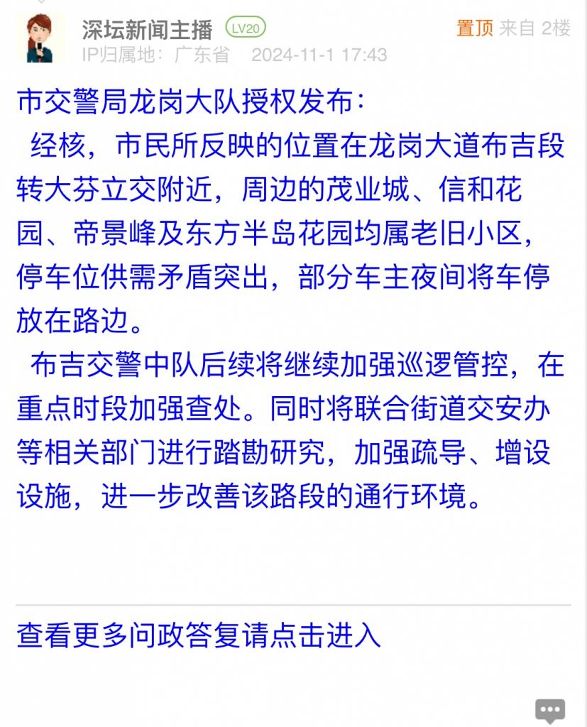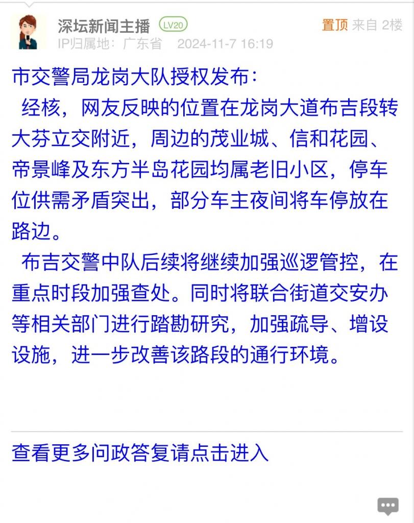 经核,市民所反映的位置在龙岗大道布吉段转大芬立交附近,周边的茂业城、信和花园、帝景峰及东方半岛花园均属老旧小区,停车位供需矛盾突出,部分车主夜间将车停放在路边。