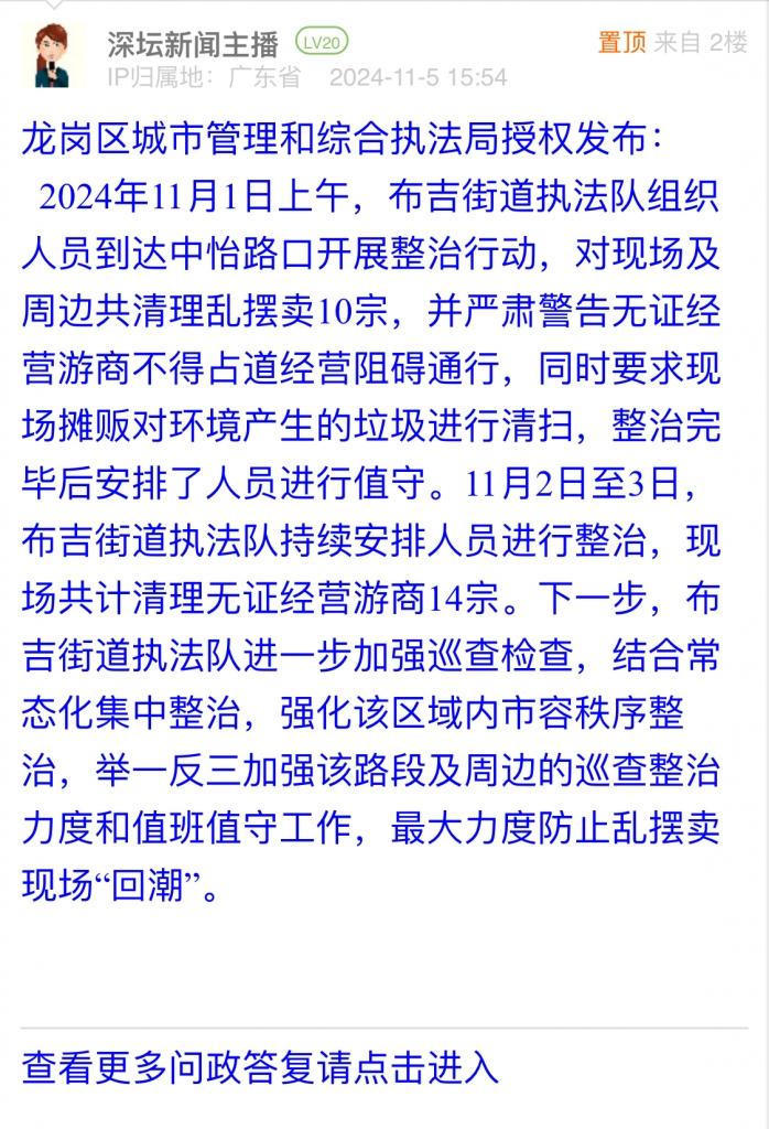 2024年11月1日上午,布吉街道执法队组织人员到达中怡路口开展整治行动,对现场及周边共清理乱摆卖10宗,并严肃警告无证经营游商不得占道经营阻碍通行,同时要求现场摊贩对环境产生的垃圾进行清扫,整治完毕后安排了人员进行值守。11月2日至3日,布吉街道执法队持续安排人员进行整治,现场共计清理无证经营游商14宗。下一步,布吉街道执法队进一步加强巡查检查,结合常态化集中整治,强化该区域内市容秩序整治,举一反三加强该路段及周边的巡查整治力度和值班值守工作,最大力度防止乱摆卖现场“回潮”。