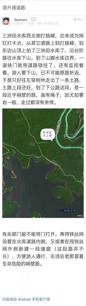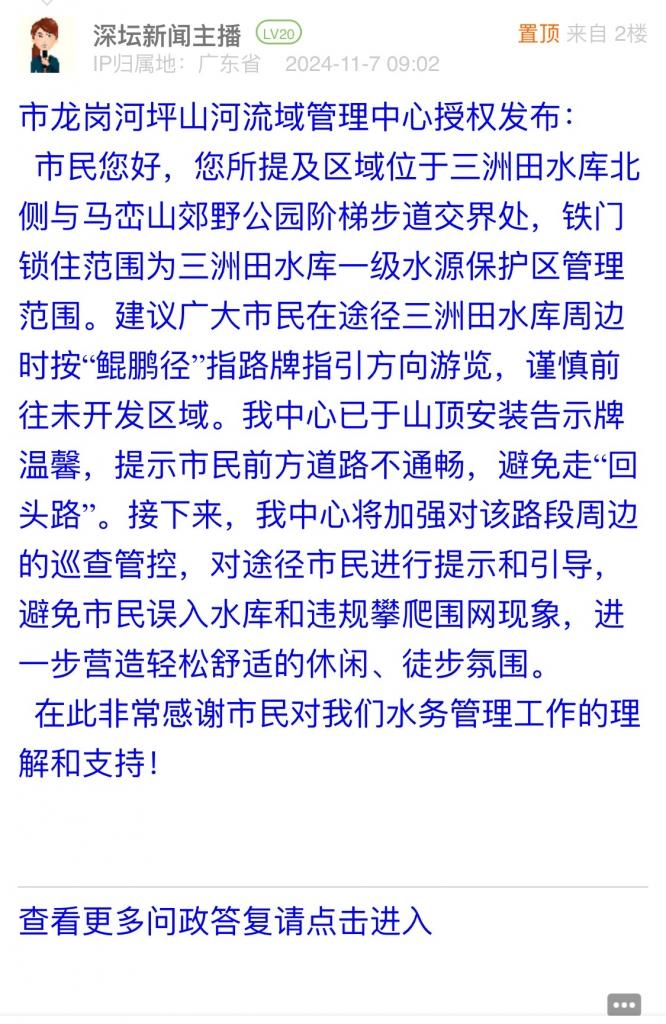 市民您好,您所提及区域位于三洲田水库北侧与马峦山郊野公园阶梯步道交界处,铁门锁住范围为三洲田水库一级水源保护区管理范围。建议广大市民在途径三洲田水库周边时按“鲲鹏径”指路牌指引方向游览,谨慎前往未开发区域。我中心已于山顶安装告示牌温馨,提示市民前方道路不通畅,避免走“回头路”。接下来,我中心将加强对该路段周边的巡查管控,对途径市民进行提示和引导,避免市民误入水库和违规攀爬围网现象,进一步营造轻松舒适的休闲、徒步氛围。