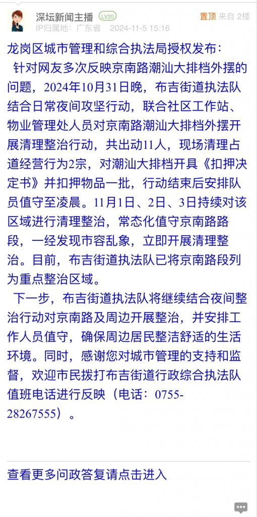 针对网友多次反映京南路潮汕大排档外摆的问题,2024年10月31日晚,布吉街道执法队结合日常夜间攻坚行动,联合社区工作站、物业管理处人员对京南路潮汕大排档外摆开展清理整治行动,共出动11人,现场清理占道经营行为2宗,对潮汕大排档开具《扣押决定书》并扣押物品一批,行动结束后安排队员值守至凌晨。11月1日、2日、3日持续对该区域进行清理整治,常态化值守京南路路段,一经发现市容乱象,立即开展清理整治。目前,布吉街道执法队已将京南路段列为重点整治区域。