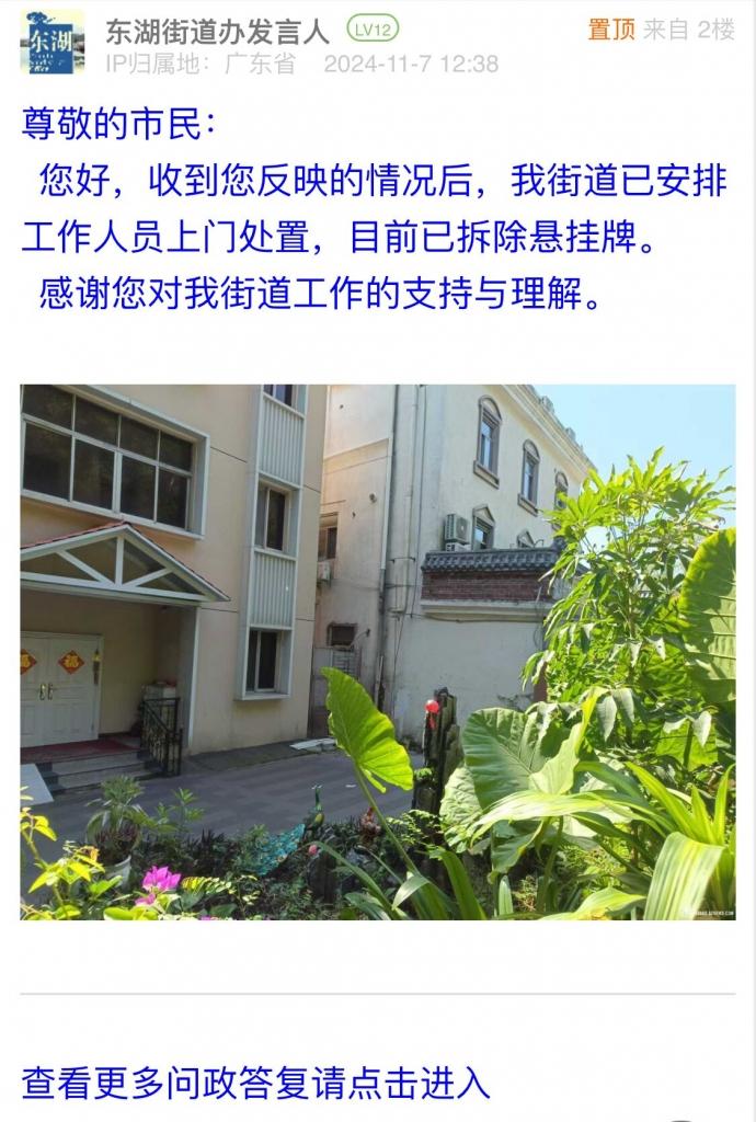 您好,收到您反映的情况后,我街道已安排工作人员上门处置,目前已拆除悬挂牌。