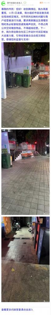 尊敬的市民:您好!收到舆情后,我办高度重视,11月1日凌晨,我办组织市容巡查员前往现场核实情况,对市民所反映的问题与商户经营者进行沟通,要求商家搬运及清理货物时务必轻拿轻放避免噪声扰民,不得占用公共空间堆放物品,不得超线经营。下一步,我办将会联合社区工作站针对该区域加大巡查力度,引导经营者合法合规文明经营。感谢您的监督与支持!