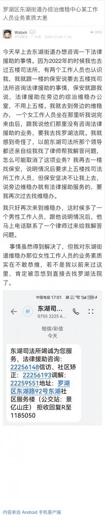4. 帖文《罗湖区东湖街道办综治维稳中心某工作人员业务素质太差》