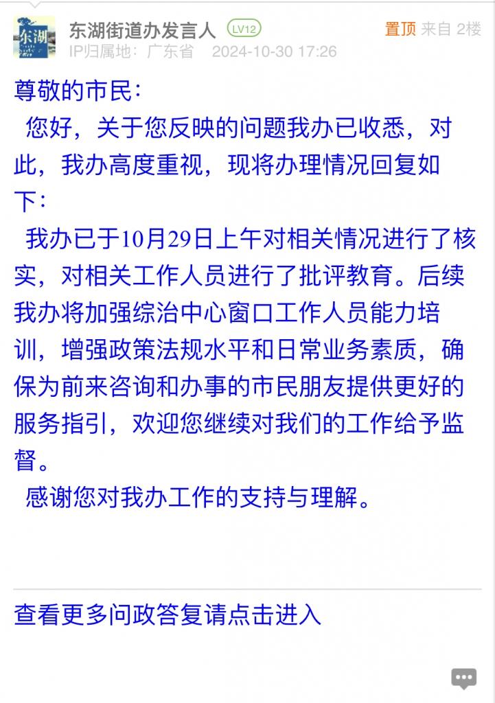 我办已于10月29日上午对相关情况进行了核实,对相关工作人员进行了批评教育。后续我办将加强综治中心窗口工作人员能力培训,增强政策法规水平和日常业务素质,确保为前来咨询和办事的市民朋友提供更好的服务指引,欢迎您继续对我们的工作给予监督。