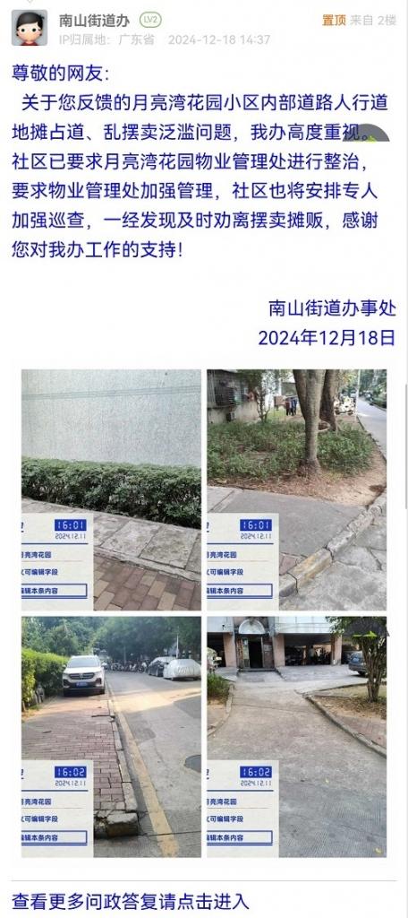 17. 帖文《投诉:南山区南山街道月亮湾花园小区【内部道路】人行道被占道摆摊 乱摆卖泛滥,无人管理》