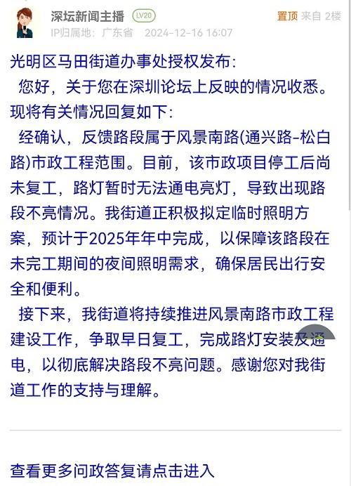 您好,关于您在深圳论坛上反映的情况收悉。现将有关情况回复如下:经确认,反馈路段属于风景南路(通兴路-松白路)市政工程范围。目前,该市政项目停工后尚未复工,路灯暂时无法通电亮灯,导致出现路段不亮情况。我街道正积极拟定临时照明方案,预计于2025年年中完成,以保障该路段在未完工期间的夜间照明需求,确保居民出行安全和便利。接下来,我街道将持续推进风景南路市政工程建设工作,争取早日复工,完成路灯安装及通电,以彻底解决路段不亮问题。感谢您对我街道工作的支持与理解。