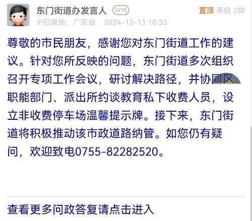 尊敬的市民朋友,感谢您对东门街道工作的建议。针对您所反映的问题,东门街道多次组织召开专项工作会议,研讨解决路径,并协同区职能部门、派出所约谈教育私下收费人员,设立非收费停车场温馨提示牌。接下来,东门街道将积极推动该市政道路纳管。如您仍有疑问,欢迎致电0755-82282520。