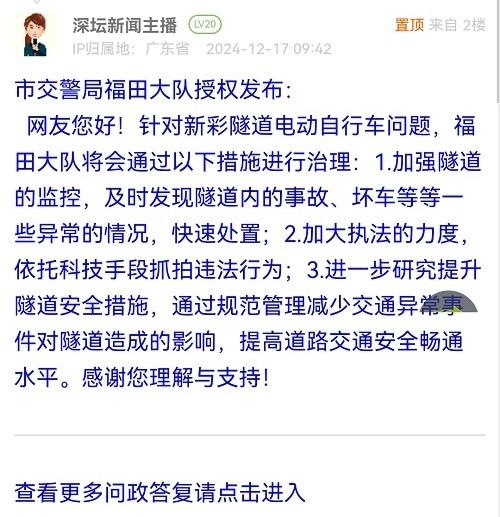 网友您好!针对新彩隧道电动自行车问题,福田大队将会通过以下措施进行治理:1.加强隧道的监控,及时发现隧道内的事故、坏车等等一些异常的情况,快速处置;2.加大执法的力度,依托科技手段抓拍违法行为;3.进一步研究提升隧道安全措施,通过规范管理减少交通异常事件对隧道造成的影响,提高道路交通安全畅通水平。感谢您理解与支持!