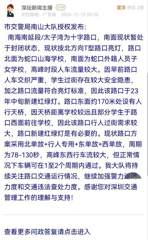 南海南延段/太子湾为十字路口,南面现状暂处于封闭状态,现状按北方向T型路口亮灯,路口北面为蛇口山海学校,南面为蛇口外籍人员子女学校,高峰时段人车流量较大。因早前路口人车交织严重,学生过街存在较大安全隐患,加之路口流量符合亮灯标准,因此该路口于23年中旬新建红绿灯。路口东面约170米处设有人行天桥,因天桥距离学校较远且部分学生于路口西面前往学校,因此该路口行人过街需求较大,路口新建红绿灯是有必要的。现状路口方案采用北单放+行人专用+东单放+西单放,周期为78-130秒,高峰东西行车流较大,但正常情况下车辆可在1至2个周期内通过。我大队将持续关注路口交通运行情况,继续加强警力巡逻力度和交通违法查处力度。感谢您对深圳交通管理工作的理解与支持!