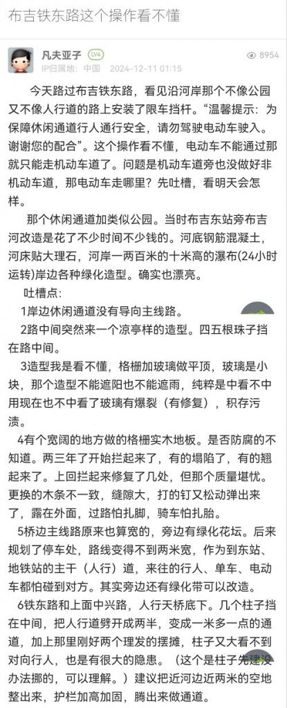 一、关于安装人车分流护栏的情况说明。近期,我局多次收到市民投诉,在布吉街道铁东路城市客厅段散步时,常有电动车快速穿行,导致与散步的市民及儿童发生刮蹭,对人身安全构成威胁,要求相关部门采取相应措施以实现人车分流。此外,该区域建有景观凉亭、花坛、休闲通道等设施,其主要功能是为市民提供休闲散步的场所,并非市政道路,车辆通行易引发安全问题。鉴于上述情况,为保障市民的人身安全,近期我局在该路段的出入口安装人车分流护栏,并设置了相应的标识牌。