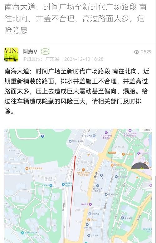 23. 帖文《南海大道:时间广场至新时代广场路段 南往北向,井盖不合理,高过路面太多,危险隐患》
