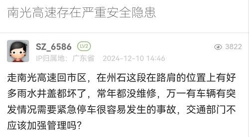 市民您好,南光高速路肩设置雨水井用于排放路面雨水,由于南光高速车流量大,重载车辆多,雨水井盖损坏频率高。接到情况反馈后,我处立即组织管养单位开展应急处置及维修,并对井盖周边路面进行重新浇筑加固,已于12月10日修复完毕。后续,将督促管养单位进一步做好道路设施巡查和养护工作,及时发现并处置道路安全隐患。感谢您对深圳交通运输工作的监督与支持!