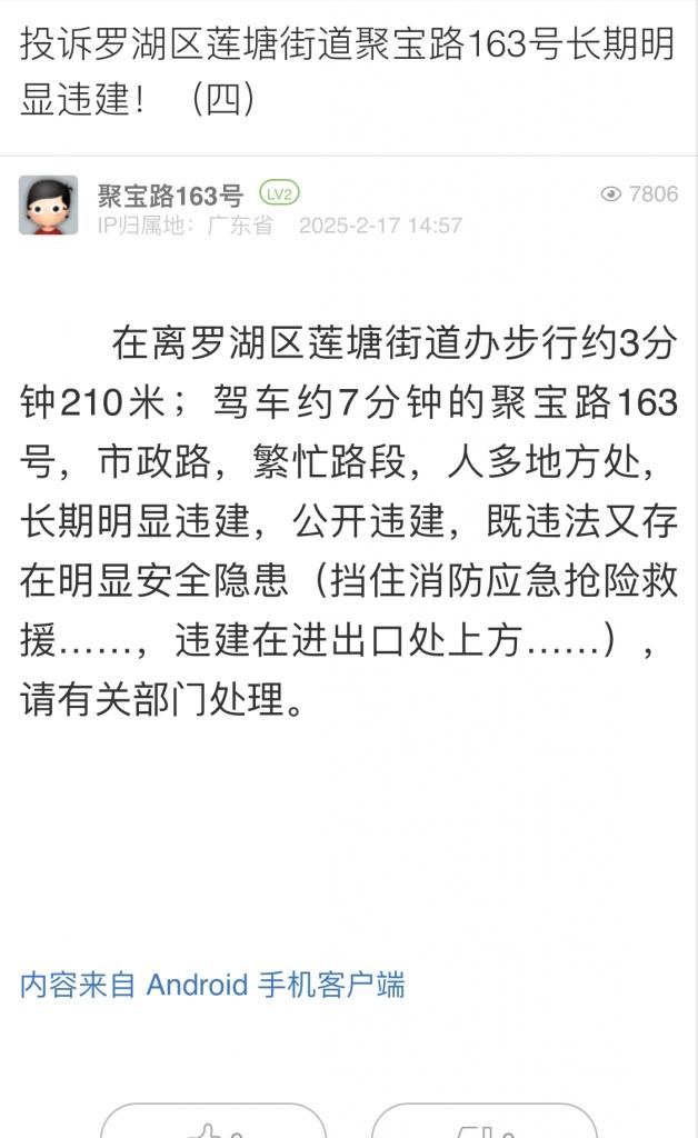 20. 帖文《投诉罗湖区莲塘街道聚宝路163号长期明显违建!(四)》