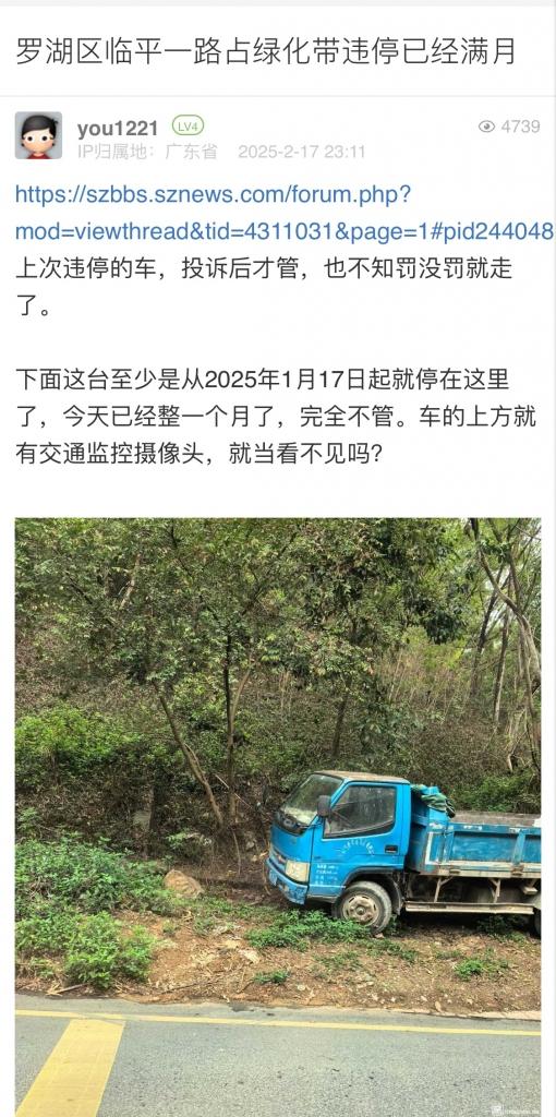 3. 帖文《罗湖区临平一路占绿化带违停已经满月》