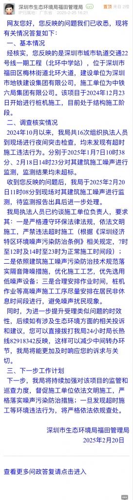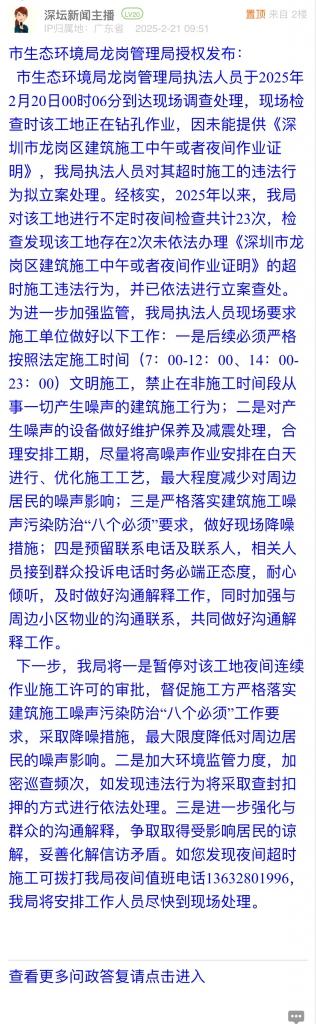 市生态环境局龙岗管理局执法人员于2025年2月20日00时06分到达现场调查处理,现场检查时该工地正在钻孔作业,因未能提供《深圳市龙岗区建筑施工中午或者夜间作业证明》,我局执法人员对其超时施工的违法行为拟立案处理。经核实,2025年以来,我局对该工地进行不定时夜间检查共计23次,检查发现该工地存在2次未依法办理《深圳市龙岗区建筑施工中午或者夜间作业证明》的超时施工违法行为,并已依法进行立案查处。为进一步加强监管,我局执法人员现场要求施工单位做好以下工作:一是后续必须严格按照法定施工时间(7:00-12:00、14:00-23:00)文明施工,禁止在非施工时间段从事一切产生噪声的建筑施工行为;二是对产生噪声的设备做好维护保养及减震处理,合理安排工期,尽量将高噪声作业安排在白天进行、优化施工工艺,最大程度减少对周边居民的噪声影响;三是严格落实建筑施工噪声污染防治“八个必须”要求,做好现场降噪措施;四是预留联系电话及联系人,相关人员接到群众投诉电话时务必端正态度,耐心倾听,及时做好沟通解释工作,同时加强与周边小区物业的沟通联系,共同做好沟通解释工作。