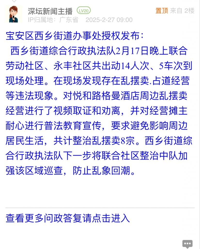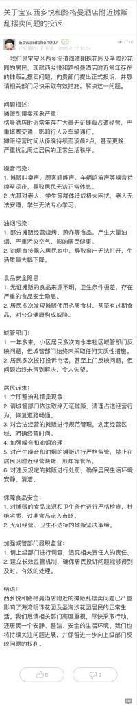 21. 帖文《关于宝安西乡悦和路格曼酒店附近摊贩乱摆卖问题的投诉》