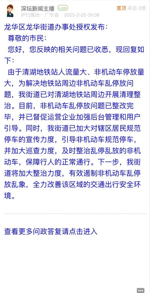 各职能单位如需对网友反映的问题进行回应,可在深圳论坛注册官方账号并通过认证,回帖进行回应。