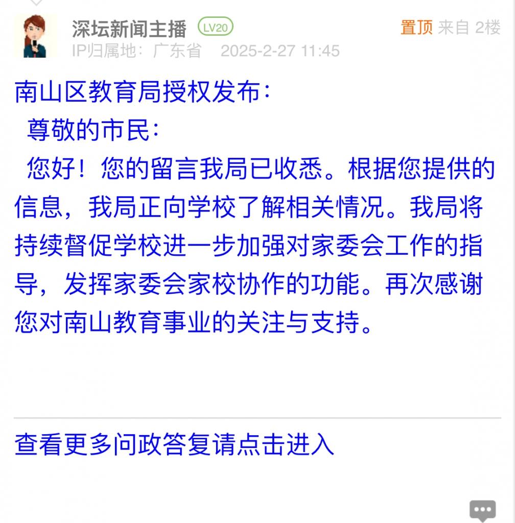 您好!您的留言我局已收悉。根据您提供的信息,我局正向学校了解相关情况。我局将持续督促学校进一步加强对家委会工作的指导,发挥家委会家校协作的功能。再次感谢您对南山教育事业的关注与支持。