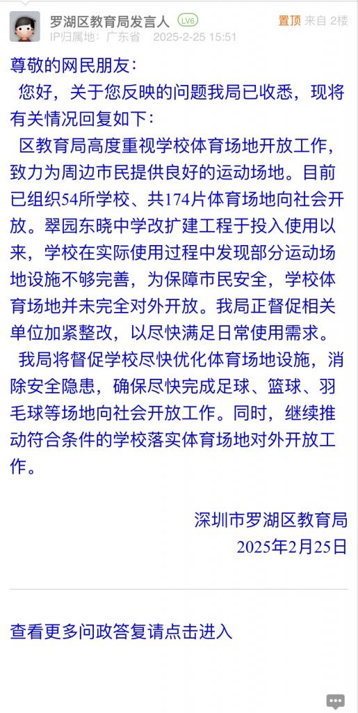 区教育局高度重视学校体育场地开放工作,致力为周边市民提供良好的运动场地。目前已组织54所学校、共174片体育场地向社会开放。翠园东晓中学改扩建工程于投入使用以来,学校在实际使用过程中发现部分运动场地设施不够完善,为保障市民安全,学校体育场地并未完全对外开放。我局正督促相关单位加紧整改,以尽快满足日常使用需求。