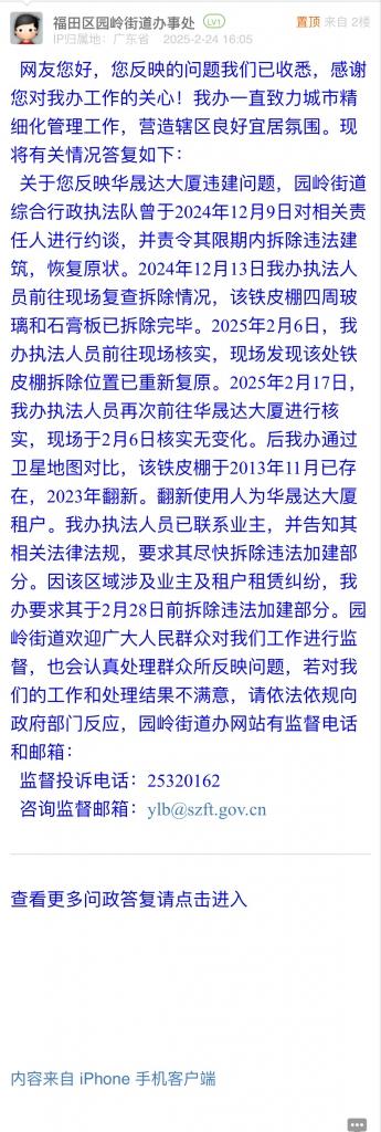 关于您反映华晟达大厦违建问题,园岭街道综合行政执法队曾于2024年12月9日对相关责任人进行约谈,并责令其限期内拆除违法建筑,恢复原状。2024年12月13日我办执法人员前往现场复查拆除情况,该铁皮棚四周玻璃和石膏板已拆除完毕。2025年2月6日,我办执法人员前往现场核实,现场发现该处铁皮棚拆除位置已重新复原。2025年2月17日,我办执法人员再次前往华晟达大厦进行核实,现场于2月6日核实无变化。后我办通过卫星地图对比,该铁皮棚于2013年11月已存在,2023年翻新。翻新使用人为华晟达大厦租户。我办执法人员已联系业主,并告知其相关法律法规,要求其尽快拆除违法加建部分。因该区域涉及业主及租户租赁纠纷,我办要求其于2月28日前拆除违法加建部分。园岭街道欢迎广大人民群众对我们工作进行监督,也会认真处理群众所反映问题,若对我们的工作和处理结果不满意,请依法依规向政府部门反应,园岭街道办网站有监督电话和邮箱: