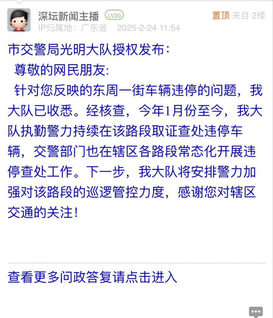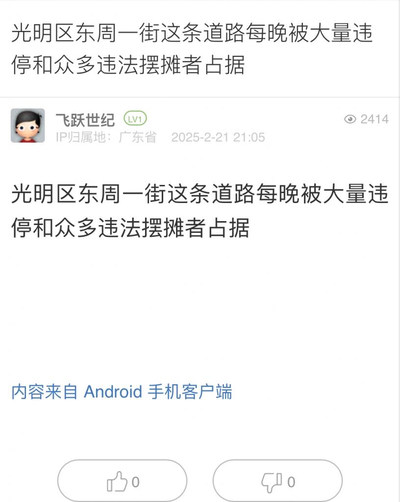 17. 帖文《光明区东周一街这条道路每晚被大量违停和众多违法摆摊者占据》