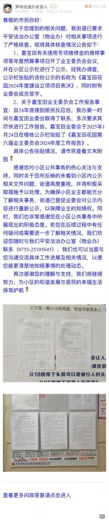 2、关于嘉宝田业主委员会工作报告事宜:自24年底接到居民反应后,我办第一时间与嘉宝田业委会取得了联系,多次要求其尽快进行工作报告。嘉宝田业委会于2025年1月24日在楼栋公示栏张贴了《嘉宝田花园第六届业主委员会2024年度工作报告》。