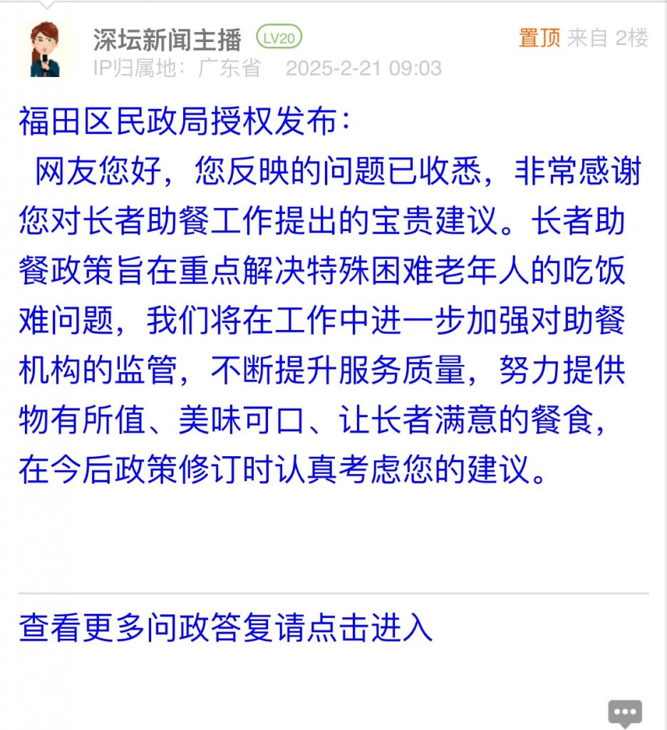 网友您好,您反映的问题已收悉,非常感谢您对长者助餐工作提出的宝贵建议。长者助餐政策旨在重点解决特殊困难老年人的吃饭难问题,我们将在工作中进一步加强对助餐机构的监管,不断提升服务质量,努力提供物有所值、美味可口、让长者满意的餐食,在今后政策修订时认真考虑您的建议。
