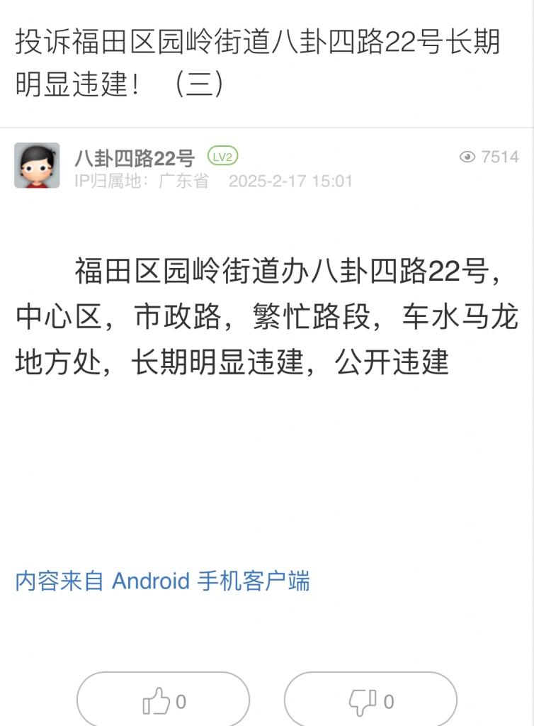 1. 帖文《投诉福田区园岭街道八卦四路22号长期明显违建!(三)》