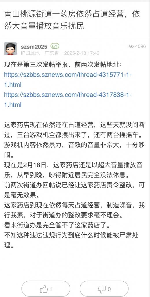 4. 帖文《南山桃源街道一药房依然占道经营,依然大音量播放音乐扰民》