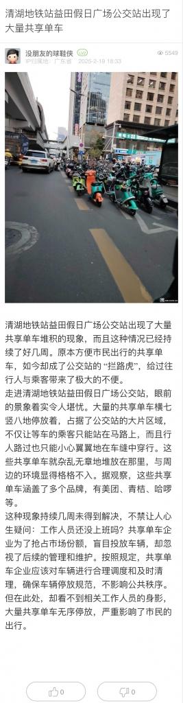 9. 帖文《清湖地铁站益田假日广场公交站出现了大量共享单车》