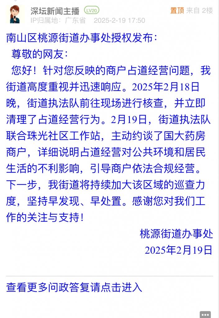 您好!针对您反映的商户占道经营问题,我街道高度重视并迅速响应。2025年2月18日晚,街道执法队前往现场进行核查,并立即清理了占道经营行为。2月19日,街道执法队联合珠光社区工作站,主动约谈了国大药房商户,详细说明占道经营对公共环境和居民生活的不利影响,引导商户依法合规经营。下一步,我街道将持续加大该区域的巡查力度,坚持早发现、早处置。感谢您对我们工作的关注与支持!