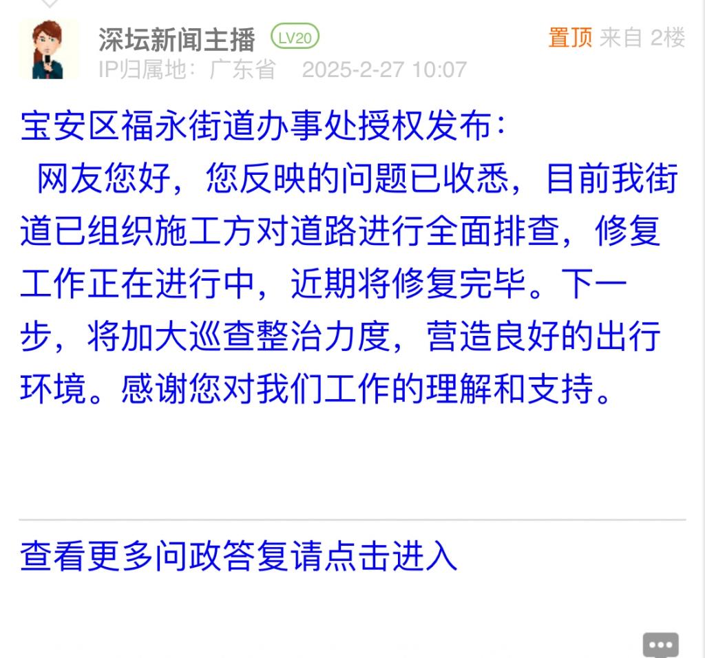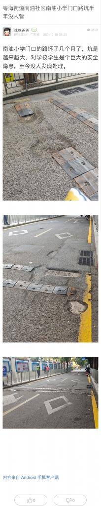 7. 帖文《粤海街道南油社区南油小学门口路坑半年没人管》