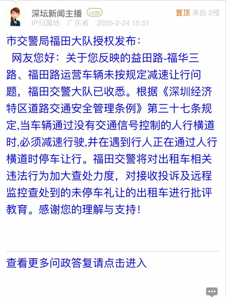 网友您好:关于您反映的益田路-福华三路、福田路运营车辆未按规定减速让行问题,福田交警大队已收悉。根据《深圳经济特区道路交通安全管理条例》第三十七条规定,当车辆通过没有交通信号控制的人行横道时,必须减速行驶,并在遇到行人正在通过人行横道时停车让行。福田交警将对出租车相关违法行为加大查处力度,对接收投诉及远程监控查处到的未停车礼让的出租车进行批评教育。感谢您的理解与支持!
