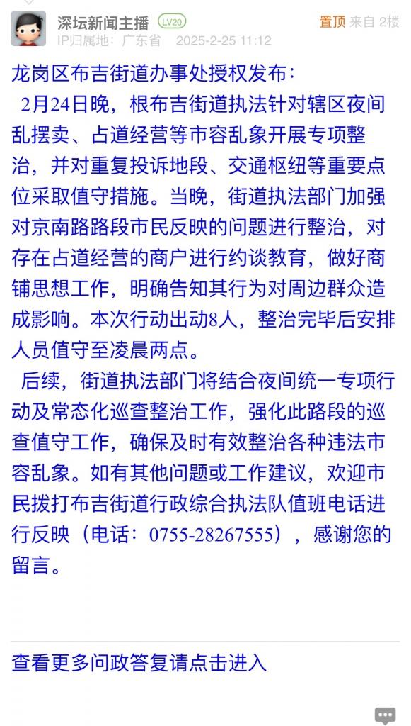 后续,街道执法部门将结合夜间统一专项行动及常态化巡查整治工作,强化此路段的巡查值守工作,确保及时有效整治各种违法市容乱象。如有其他问题或工作建议,欢迎市民拨打布吉街道行政综合执法队值班电话进行反映(电话:0755-28267555),感谢您的留言。