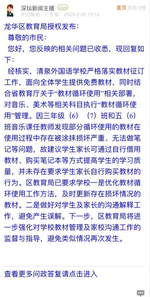 经核实,清泉外国语学校严格落实教材征订工作,面向全体学生提供免费教材,同时结合省教育厅关于“教材循环使用”相关部署,对音乐、美术等相关科目执行“教材循环使用”管理。因三年级(6)(7)班和五(6)班音乐课任教师发现部分循环使用的教材在使用过程中存在被涂抹损坏严重、无法做笔记等问题,故建议学生家长可通过自行借用教材、购买笔记本等方式提高学生的学习质量,并未存在要求学生家长自行购买教材的行为。区教育局已要求学校一是优化教材循环使用工作方法,及时更新存在损坏情况的教材。二是做好对学生及家长的沟通解释工作,避免产生误解。下一步,区教育局将进一步强化对学校教材管理及家校沟通工作的监督与指导,避免类似情况再次发生。