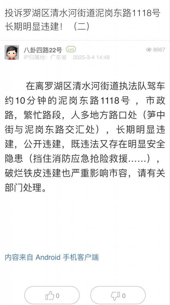 5. 帖文《投诉罗湖区清水河街道泥岗东路1118号长期明显违建!(二)》